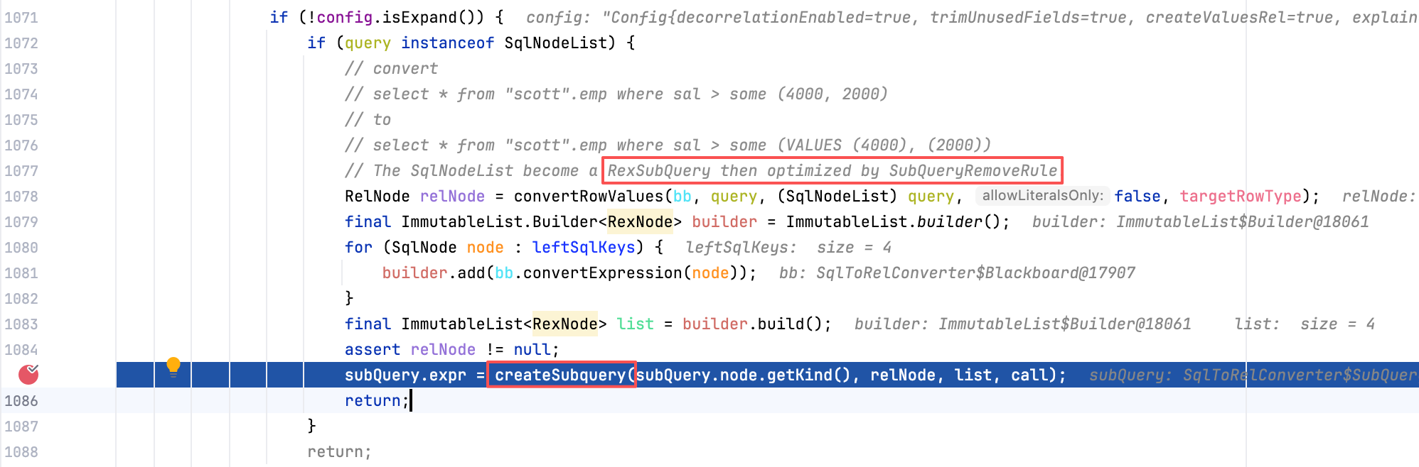 由于我们的 IN 值个数不小于 20,逻辑会继续向下执行,将 IN 转换为 RexSubQuery 子查询。从源码注释中,我们也可以看到,后续这个对象会通过 SubQueryRemoveRule 规则进行优化。