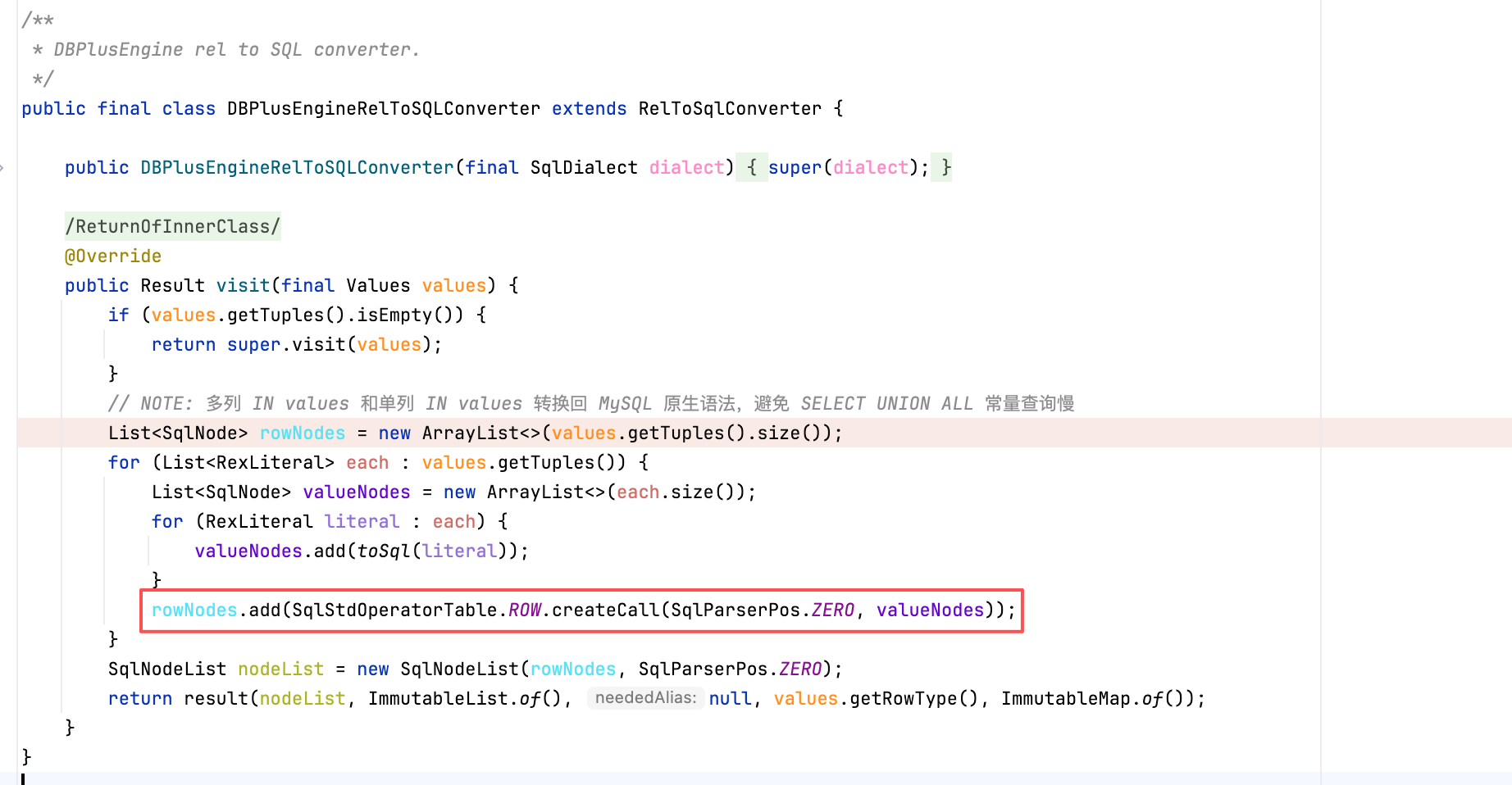 为了将 LogicalValues 转换为下推 SQL 中 MySQL 原生的 IN 语法,需要增加 DBPlusEngineRelToSQLConverter,并重写 visit(final Values values) 方法,当判断是 IN 常量子查询时,采用 ROW 语法生成 SqlNode。