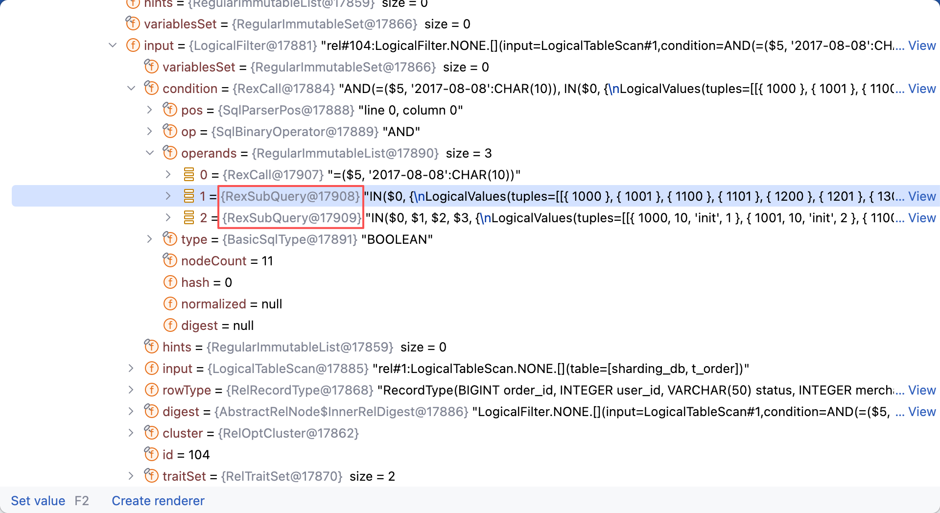 现在我们已经将问题的范围缩小到 RBO 优化过程,但是 RBO 优化使用的优化规则很多,具体是哪一个优化规则导致的呢?我们首先来 Debug,观察原始逻辑执行计划生成的过程,了解 IN 算子在 RelNode 中是如何表示的,再根据 RelNode 去排查优化规则。
