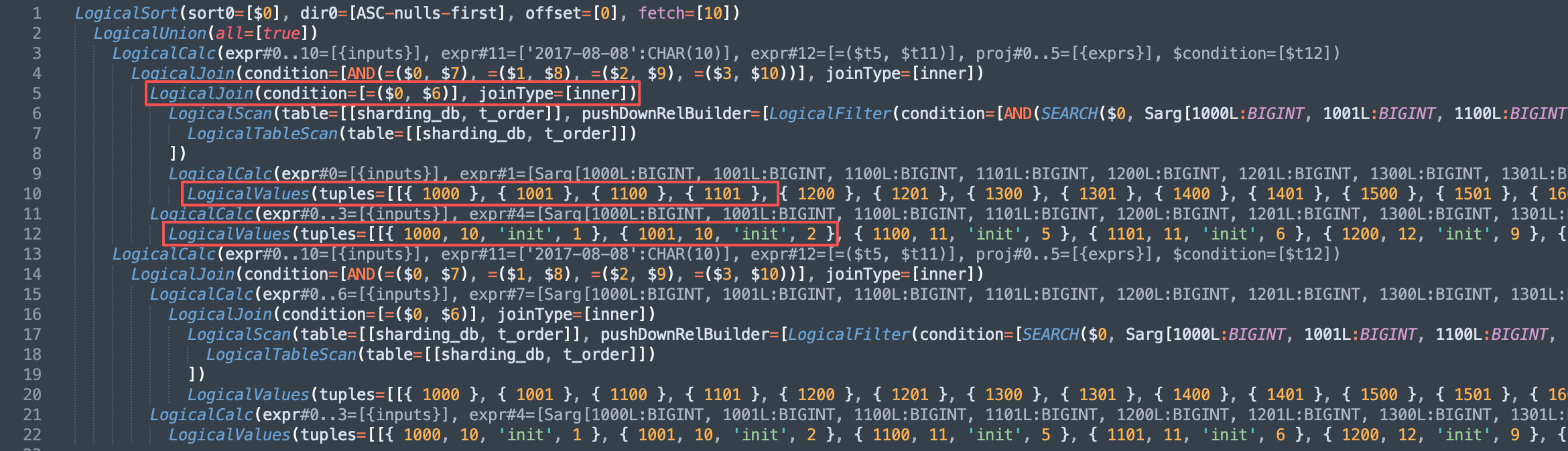 笔者刚看到这个异常,怀疑是超长 SQL 过于复杂,导致在 SQL 解析、SQL 绑定或者生成执行计划的过程中出现问题,但是看到这条 SQL 的执行计划时,大概了解了问题的原因——Calcite 对于 IN 查询,会通过 SubQueryRemoveRule 规则,将 IN 查询转换为 JOIN。由于超长 SQL 中包含了大量的 IN 查询过滤条件,转换为 JOIN 方式执行,会导致下推的 SQL 缺失 IN 过滤条件,查询数据量相比预期要多很多,从而触发多轮磁盘文件交换,最终导致执行超时异常。
