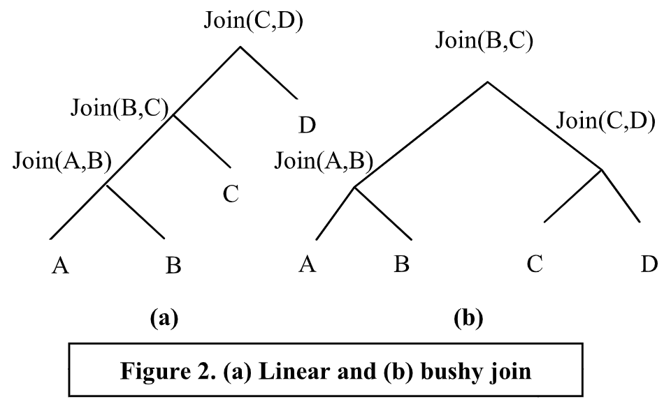 在 SPJ 查询上下文中,System-R 优化器的搜索空间由算子树组成,算子树对应了线性序列的连接操作,例如:Join(Join(Join(A,B),C),D) 的序列如图 2(a) 所示。由于连接的结合性和交换性,这些序列在逻辑上是等价的。连接算子既可以使用嵌套循环(nested loop)实现,也可以使用排序合并(sort-merge)实现。每个扫描节点即可以使用索引扫描(使用聚集或非聚集索引),也可以使用顺序扫描。最后,谓词应当尽可能早地进行计算。