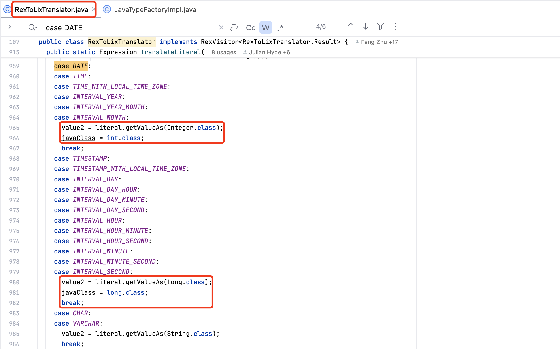 EnumUtils.internalTypes 会将操作数类型转换为内部类型,可以看到 DATE、TIME 类型会被转换为 Integer 或 int 类型,而 TIMESTAMP 类型则会被转换为 Long 或 long 类型。由于我们测试的 Date 类型,内部最终会使用 Integer 或 int 类型,因此在生成代码时需要调用 toInt 方法进行转换。