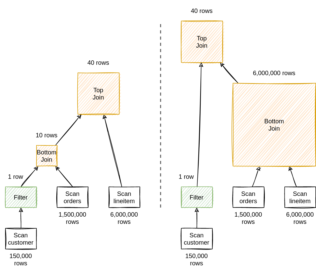 基数估计有了统计信息后,我们就可以对执行计划中的各个算子进行基数估计(Cardinality Estimation),估算这些算子产生结果的行数(或基数)。如下图所示,通过基数估计我们可以选择更优的 JOIN 顺序以减少中间结果。Scan 算子的行数可以直接从表的统计信息 Row Count 获取,而对于 Filter 算子,可以使用输入的 Scan 算子的行数乘以谓词的选择率。