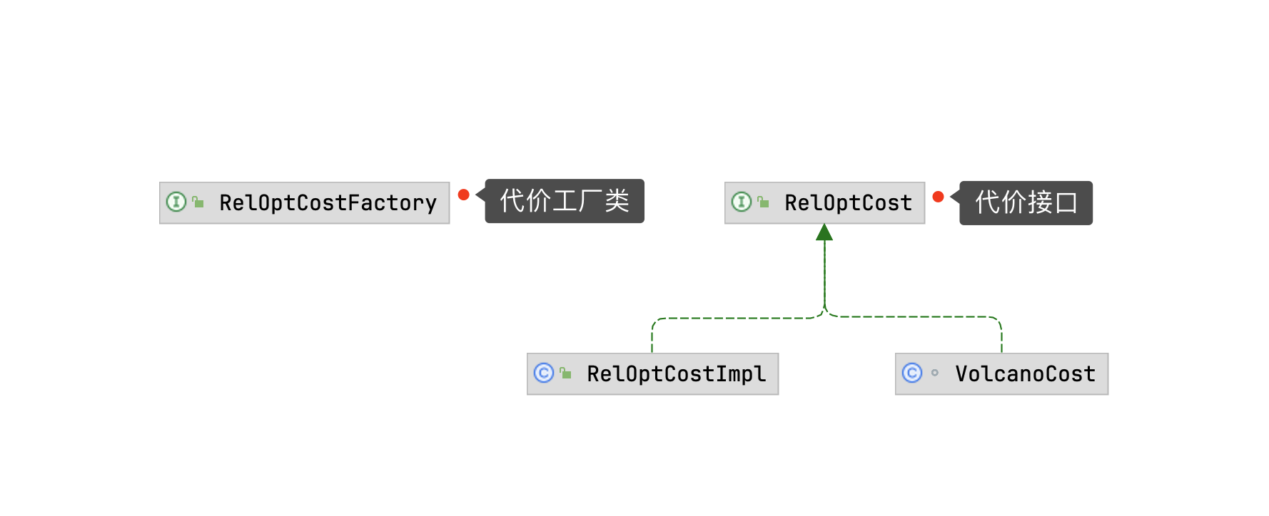 在 Caclite 中,RelOptCost 接口有两个实现类:RelOptCostImpl 和 VolcanoCost。RelOptCostImpl 是 RelOptCost 接口的默认实现,它只关注 Rows 指标,Cpu 和 Io 默认都返回 0,Caclite 中主要在 RBO 优化时使用 RelOptCostImpl 代价。VolcanoCost 与 RelOptCostImpl 不同,它同时考虑了 Rows、Cpu 和 Io 指标,Calcite 中主要在 CBO 优化时使用 VolcanoCost 代价。