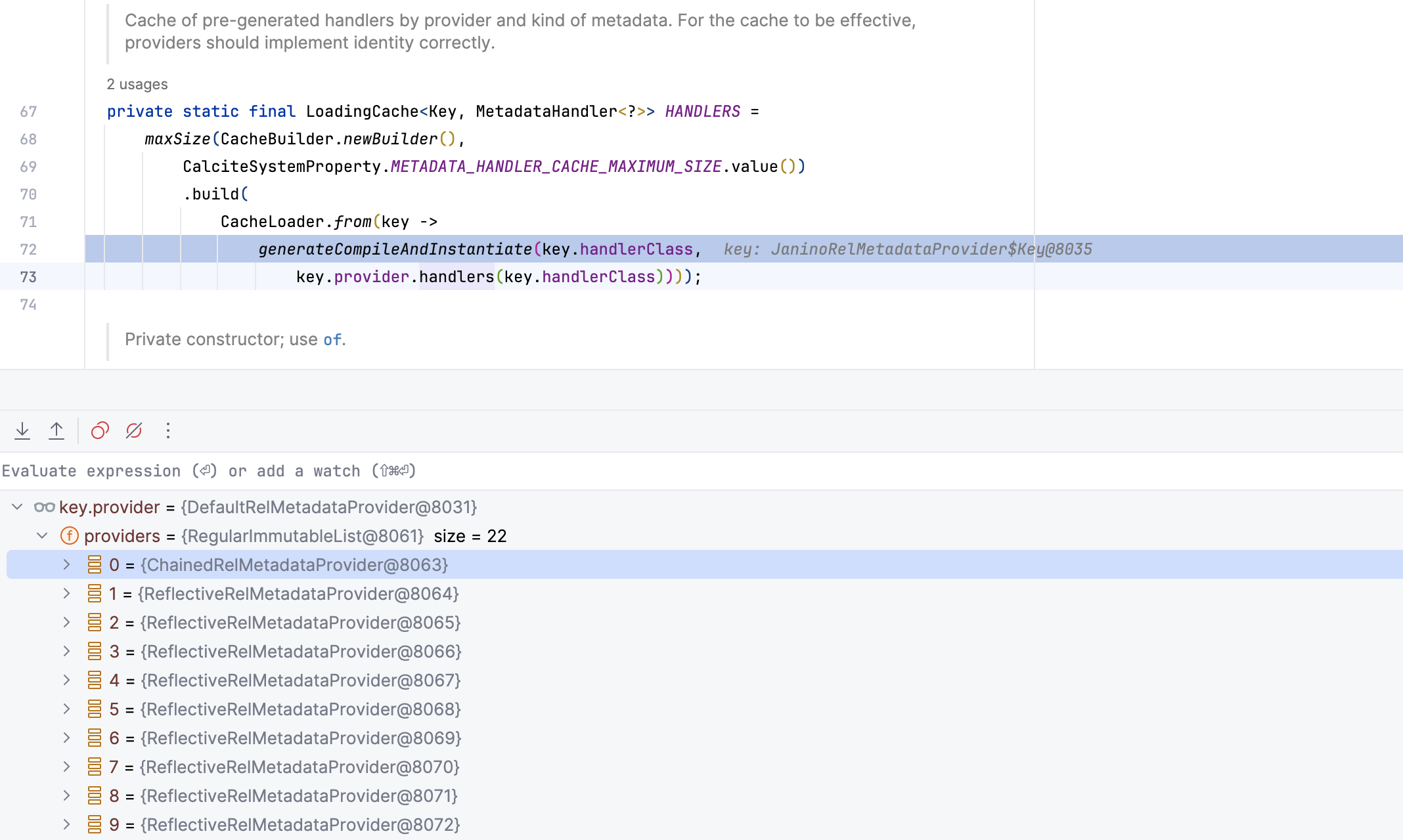 根据下图可知,key.provider 主要为 ChainedRelMetadataProvider 和 ReflectiveRelMetadataProvider,ChainedRelMetadataProvider 会按照责任链方式遍历 providers,而 ReflectiveRelMetadataProvider 则会根据 key.handlerClass 过滤出子类对象。