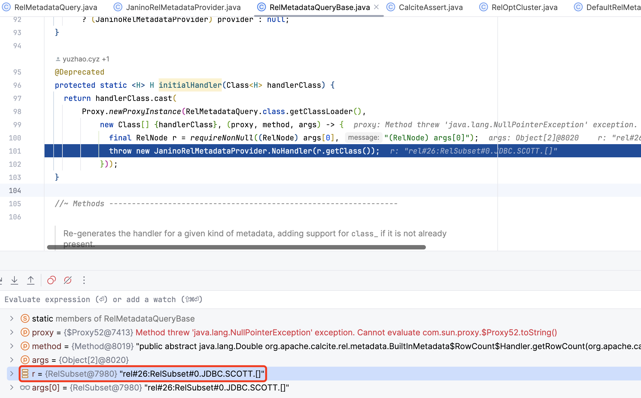 执行 JdbcAdapterTest#testJoin3TablesPlan 单测,首先会调用 RelOptCluster.create(planner, rexBuilder); 方法初始化 RelOptCluster 对象,初始化 RelOptCluster 时内部会调用 setMetadataProvider 和 setMetadataQuerySupplier 方法,下面的小节我们将分别探究下这两个初始化方法的内部实现细节。