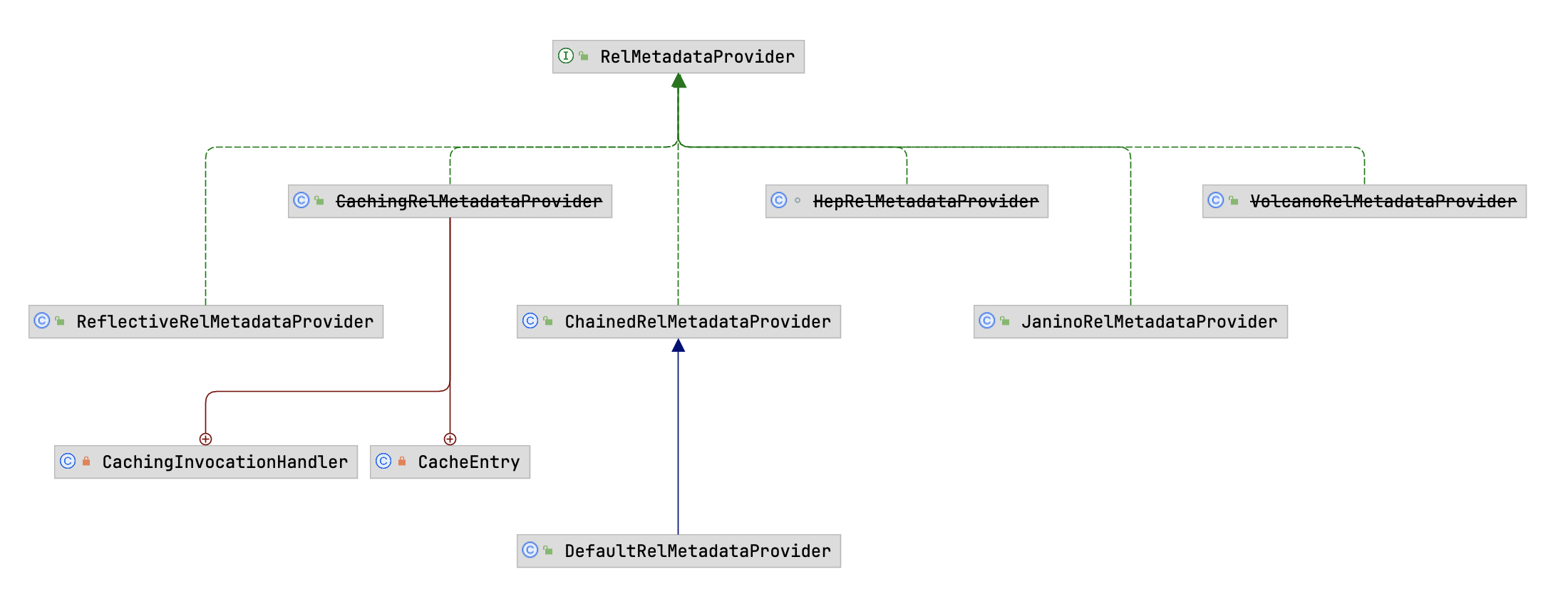 上图展示了 RelMetadataProvider 继承体系,RelMetadataProvider 接口定义了获取关系表达式元数据的方法,通常不建议直接调用,而应当使用 RelMetadataQuery 入口类获取元数据。关于设计 RelMetadataProvider 的背景和动机,可以参考 RelationalExpressionMetadata Wiki 。