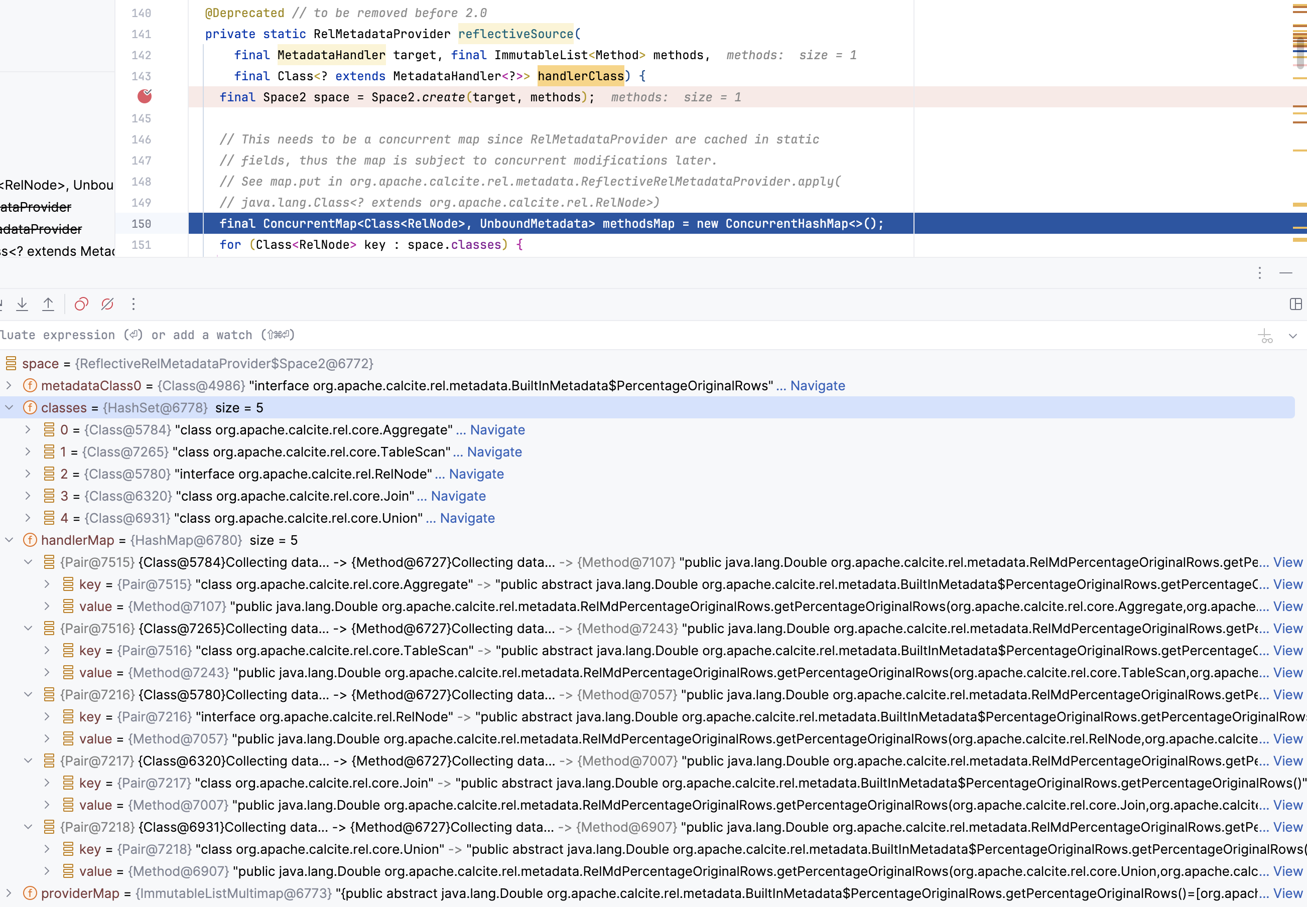 在 reflectiveSource 方法中,首先会计算哪些方法可以作为给定元数据方法的处理程序,最终的结果会记录在 Space2 对象中,下图展示了 Space2 对象中记录的 classes 和 handlerMap 信息。然后遍历 Space2 对象中记录的 classes 集合,并根据 RelNode 类和 getPercentageOriginalRows 方法查找处理方法 Method,再通过 Proxy.newProxyInstance 动态代理生成 UnboundMetadata 对象,内部核心逻辑是调用目标对象 MetadataHandler 的对应元数据方法。
