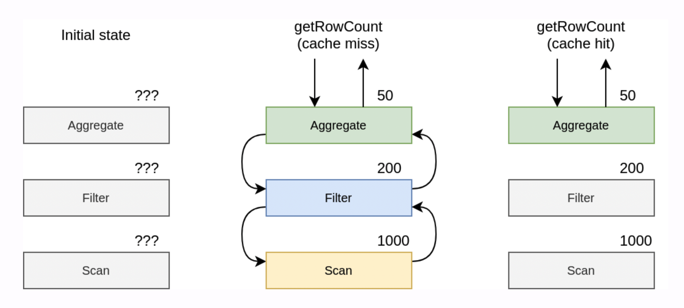 可以看到生成的 GeneratedMetadata_RowCountHandler 内部还增加了统计信息的缓存以提升性能。根据经验来看,关系代数的统计信息在较长时间内会保持不变,Calcite 会监测子节点统计信息,当子节点发生变化时会主动失效缓存数据。