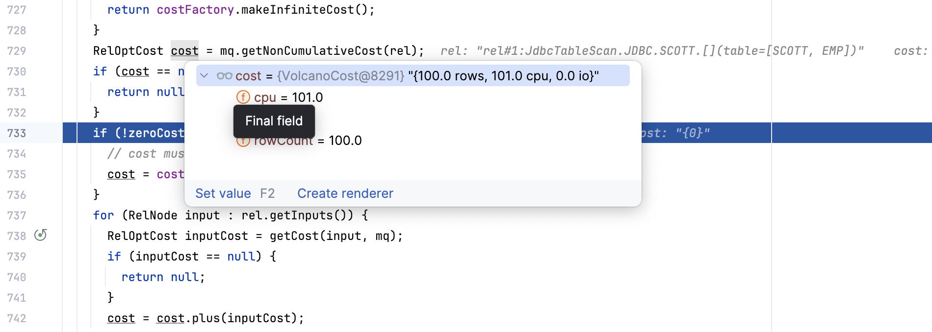 至此,我们就有了一个代表 RelNode 代价的 VolcanoCost 对象,VolcanoCost 对象属性及值如下,其中包含了 RelNode 对应的行数、CPU 消耗以及 IO 消耗。