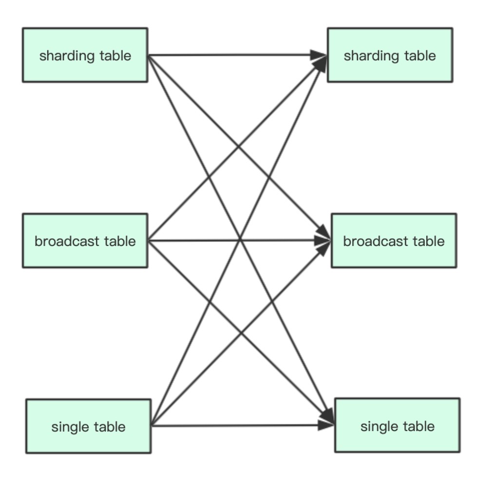 想要支持 DDL 语句多表组合路由,需要考虑许多复杂的组合场景。按照 ShardingSphere 中对于表的分类,我们可以将表划分为分片表(sharding table)、广播表(broadcast table)和单表(single table),分片表又可以组成绑定表(binding table)。关于表的详细概念可以参考下面的说明。