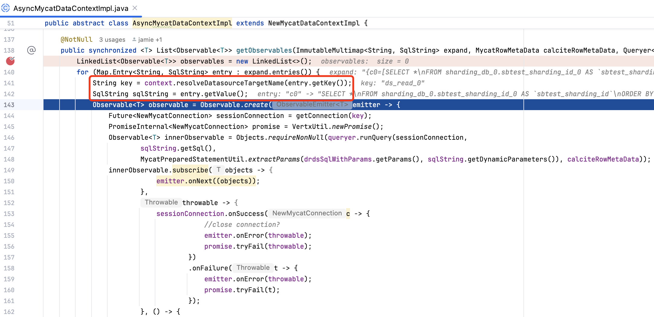 获取到 ArrayBindable 后,MyCat2 会调用 PrepareExecutor#getMysqlPayloadObjectObservable 方法,为 ArrayBindable 绑定可观察对象 AsyncMycatDataContextImpl。AsyncMycatDataContextImpl 类内部提供了 getObservables 方法,如下图所示,getObservables 方法会在对应的数据源上执行下推的 SQL,并封装为 Observable 对象。