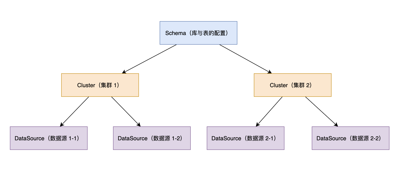 Schema 对应了 MySQL 中的库,MyCat2 Schema 配置包含了库与表的配置,它是建立在集群的基础上,而集群则是建立在数据源的基础上。因此,我们在配置时,需要自下而上进行配置,先配置数据源,再加数据源构建为集群,然后在集群上配置库与表。