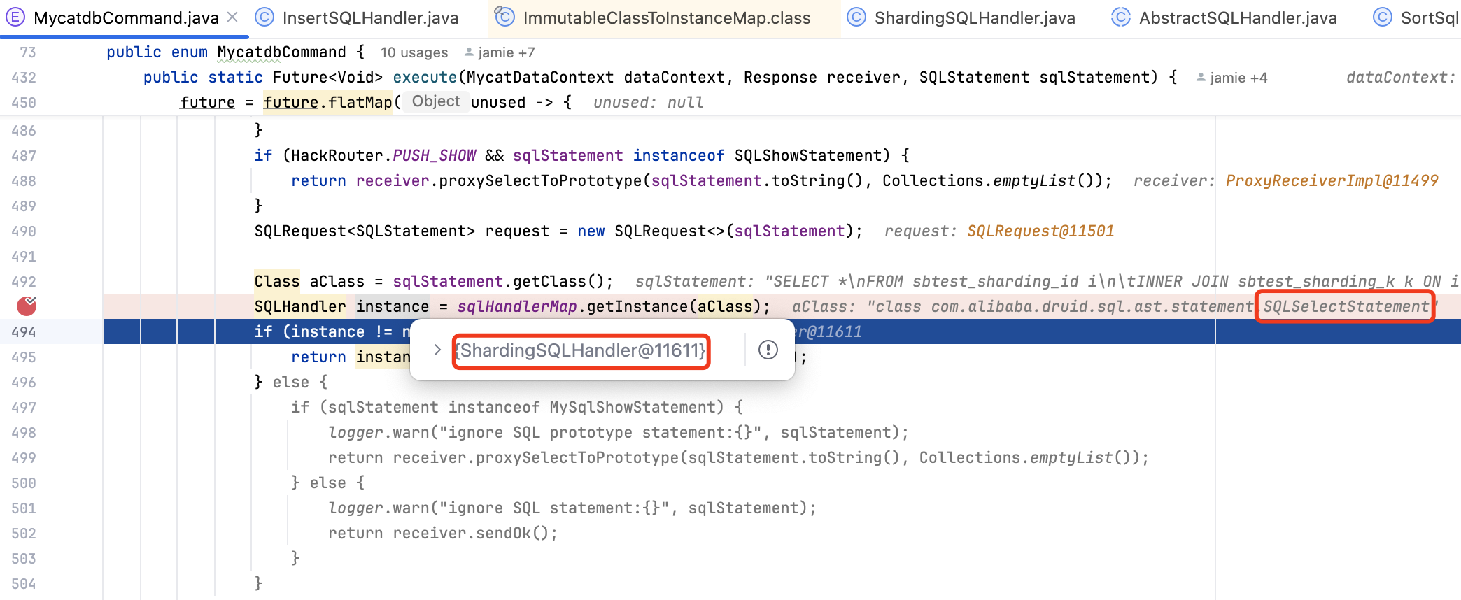 MyCat2 SQL 执行的入口在 MycatdbCommand 类中,它会根据 SQL 语句的类型生成不同的 Handler 类,SQLSelectStatement 查询语句对应的是 ShardingSQLHandler。