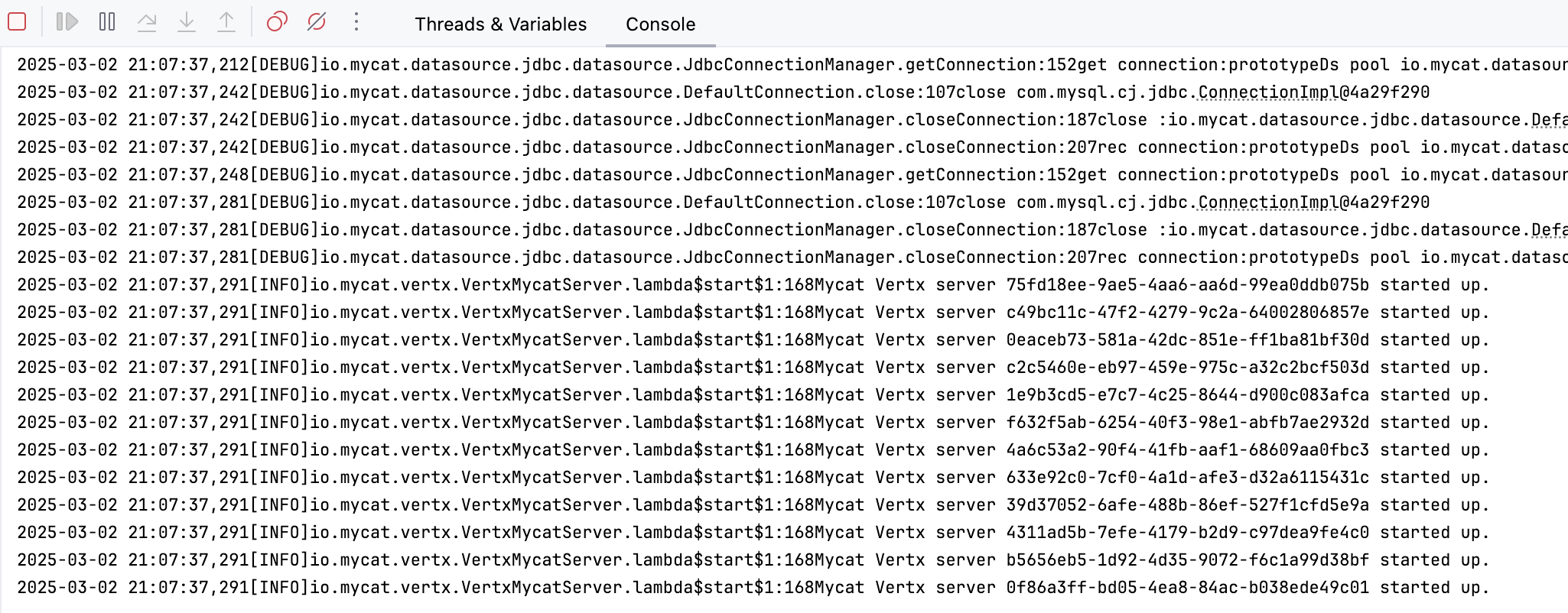 配置完成后,我们搜索 MycatCore 类进行本地启动,出现如下的日志表示启动成功。