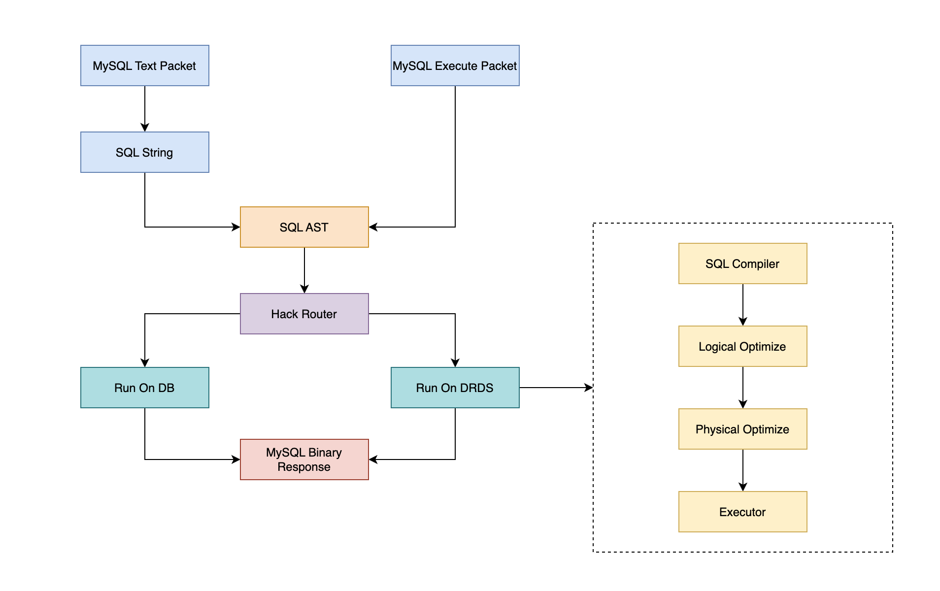 MyCat2 Calcite 实践探究 执行流程概览参考 MyCat2 SQL 编写指导 ,MyCat2 SQL 执行流程如下,服务端接收到 SQL 字符串或模板化 SQL 后,会先将 SQL 解析为 SQL AST,然后使用 Hack Router 进行路由判断,如果是一些简单的单节点 SQL,Hack Router 会直接将 SQL 路由到 DB 中执行,其他复杂的 SQL 则会进入 DRDS 处理流程。DRDS 处理流程中,会使用 Calcite 对 SQL 语句进行编译,然后生成关系代数树,并经过逻辑优化和物理优化两步,最终执行返回 SQL 结果。