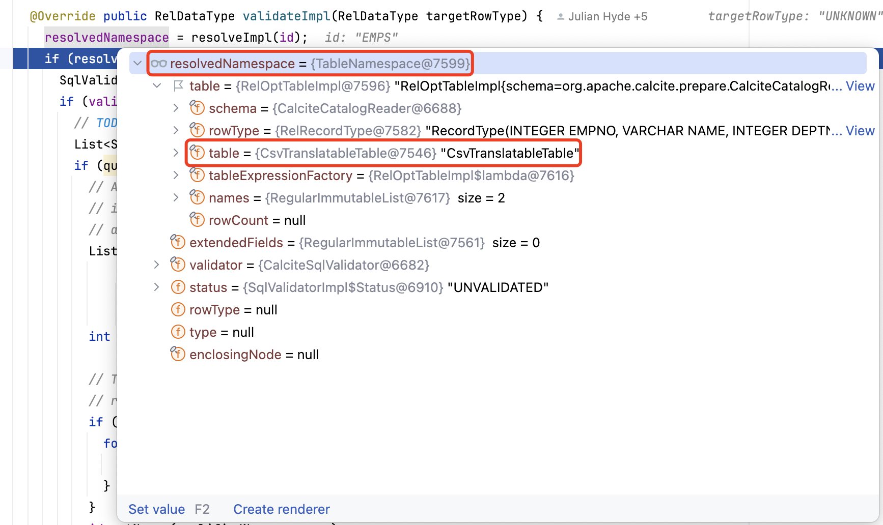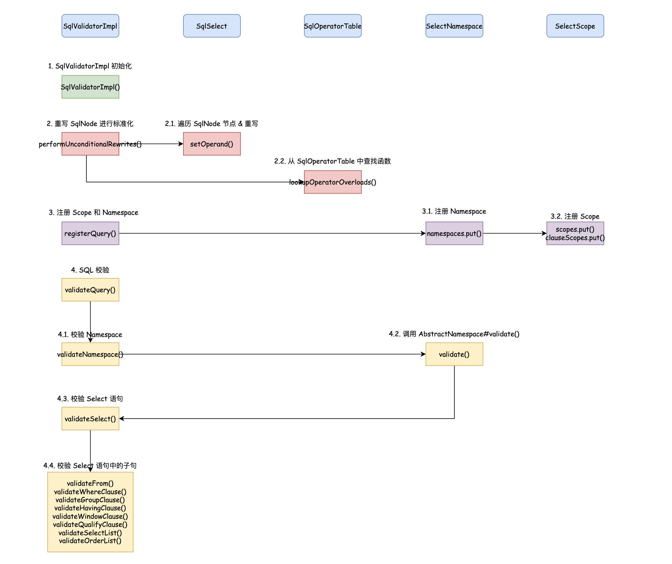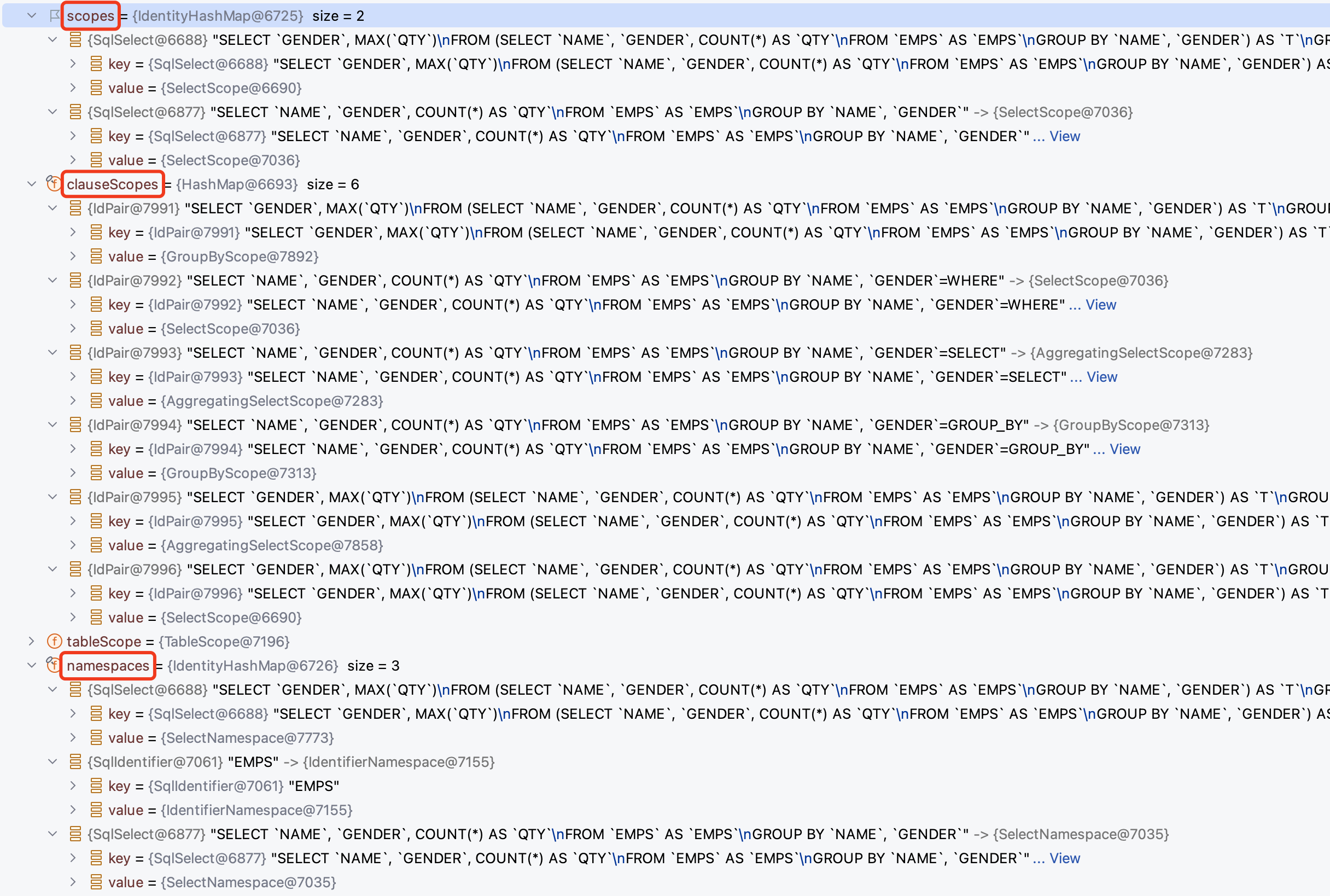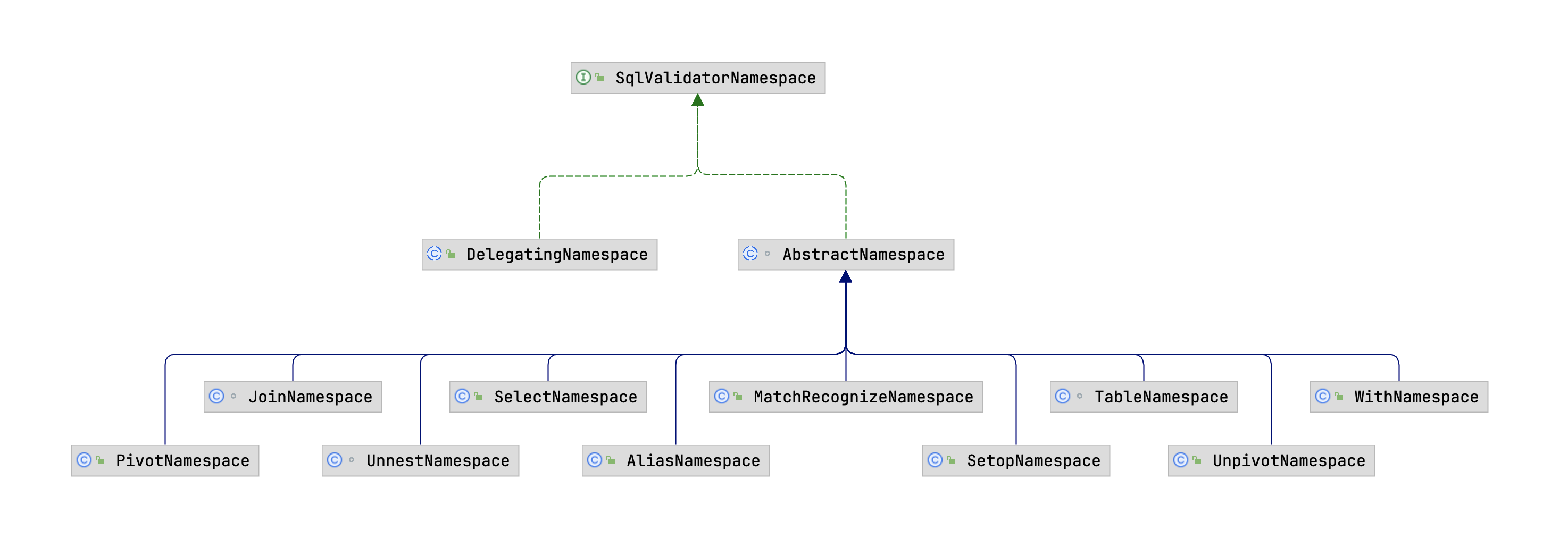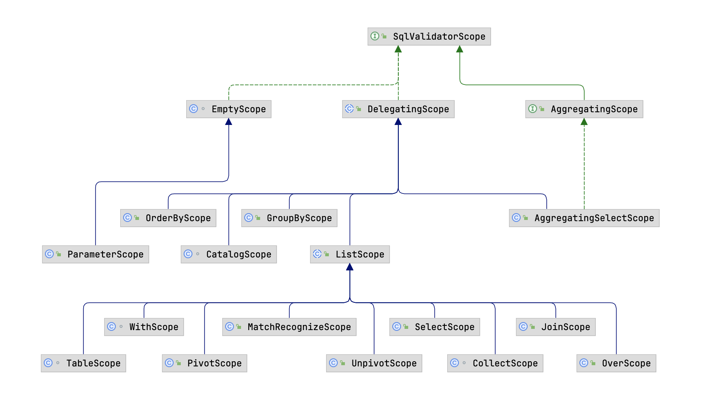 SqlValidatorScope 主要用于声明校验过程中名称解析的范围,Calcite 对 SqlValidatorScope 的具体描述为 A SqlValidatorScope describes the tables and columns accessible at a particular point in the query,即:SqlValidatorScope 描述了查询中的某个具体位置可以访问的表和列。