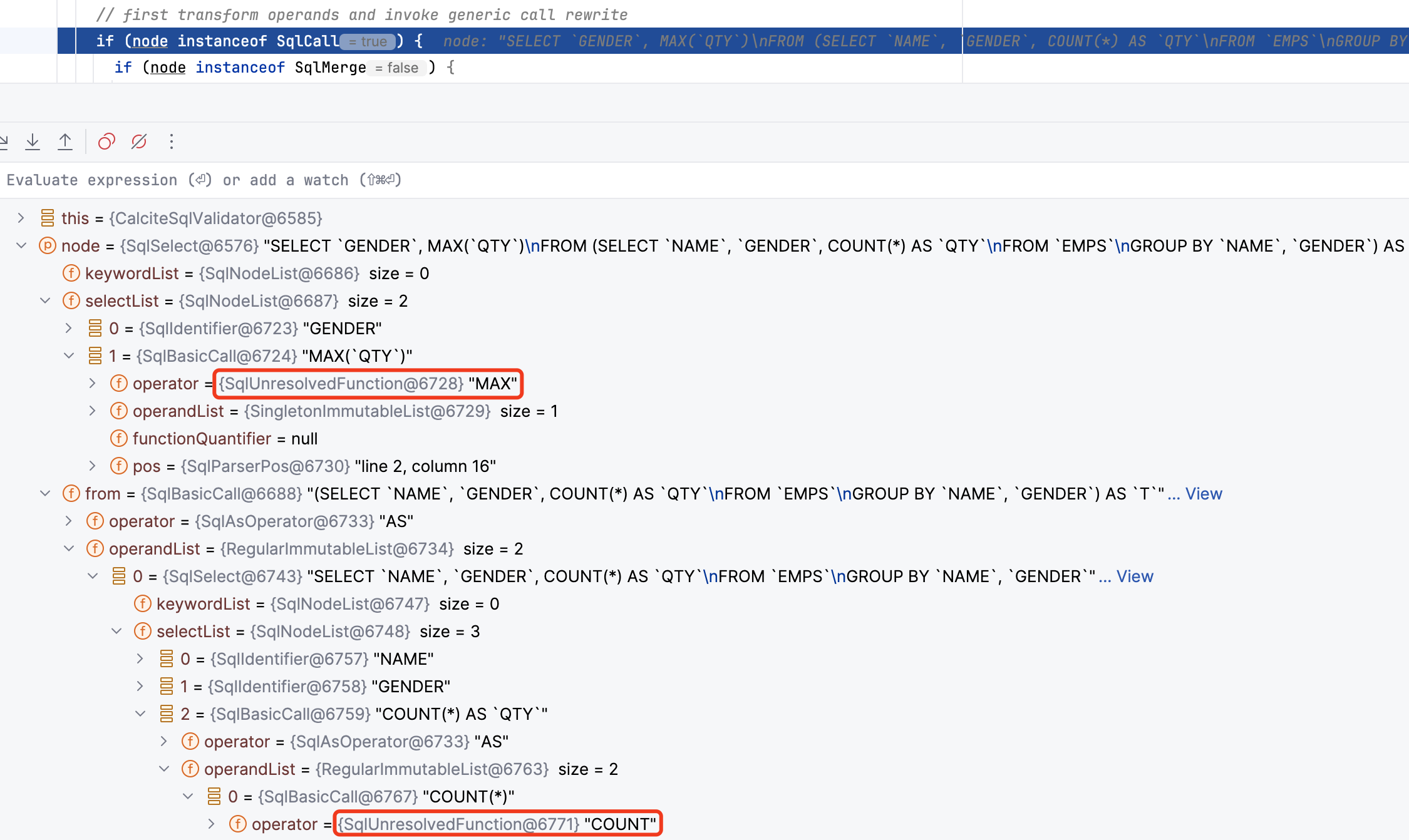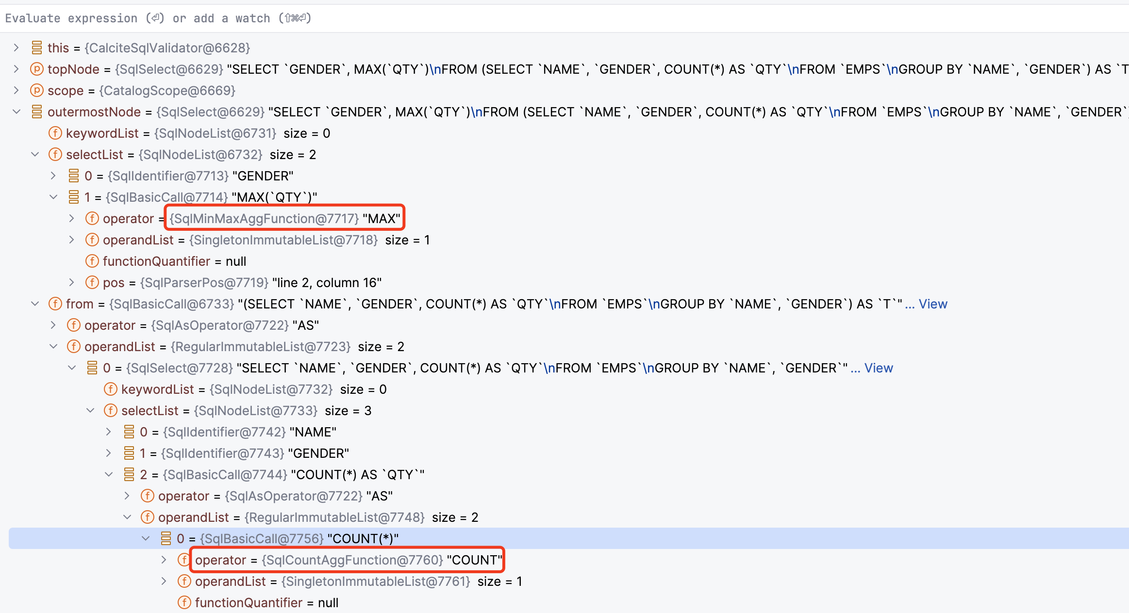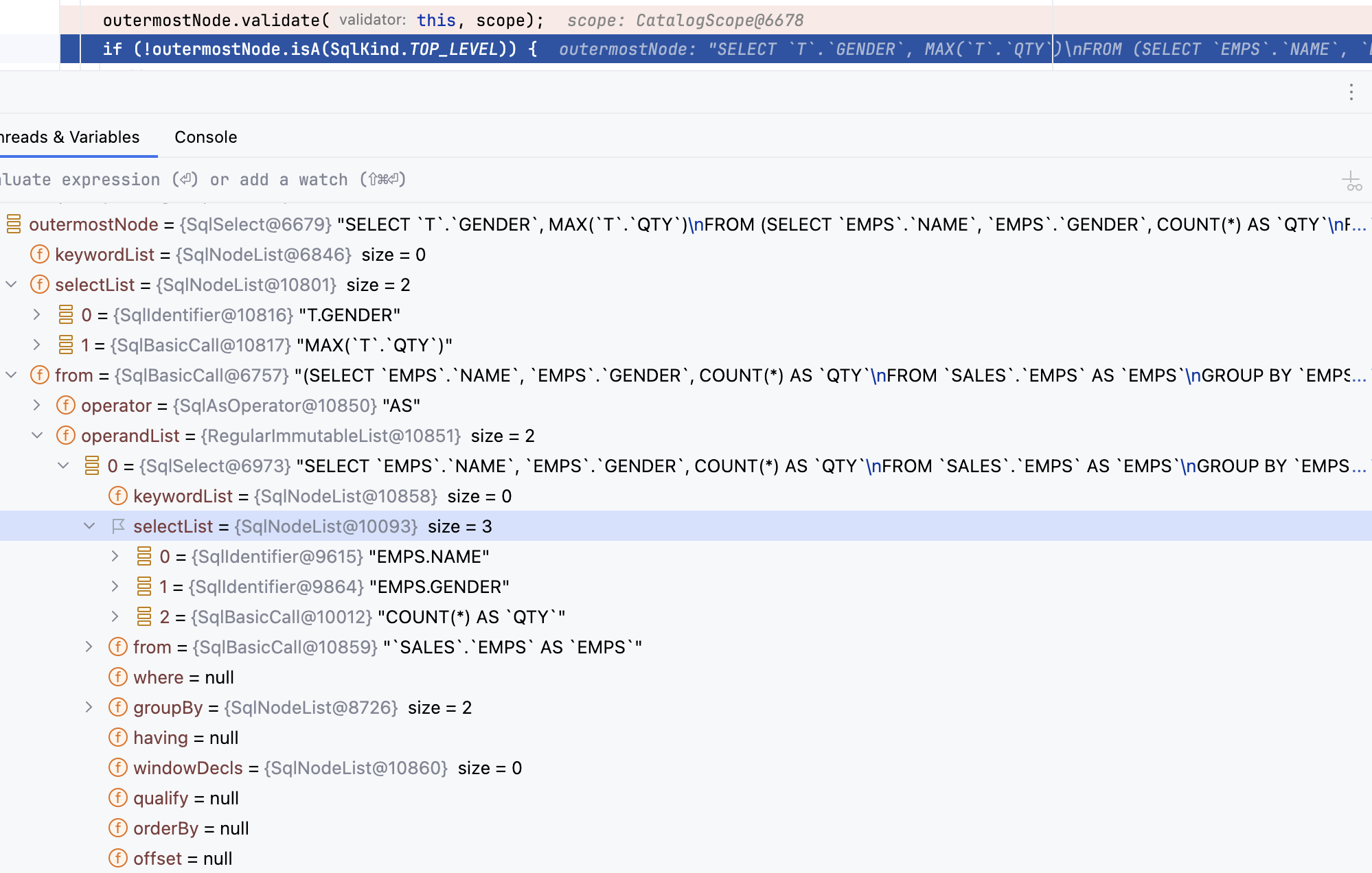 SqlCall call; List<SqlNode> operands; switch (node.getKind()) { case SELECT: ... // Start by registering the WHERE clause // clauseScopes 用于记录 Select 中的子句,用于后续子句的注册 clauseScopes.put(IdPair.of(select, Clause.WHERE), selectScope); // 注册 WHERE 运算符中的子查询 registerOperandSubQueries(selectScope, select, SqlSelect.WHERE_OPERAND); // 注册 QUALIFY 子句中的子查询,QUALIFY 子句通常用于 WINDOW 函数结果的过滤 registerOperandSubQueries( selectScope, select, SqlSelect.QUALIFY_OPERAND); // Register FROM with the inherited scope 'parentScope', not // 'selectScope', otherwise tables in the FROM clause would be // able to see each other. finalSqlNodefrom= select.getFrom(); if (from != null) { // 注册 FROM,本示例中包含了 FROM 子查询,因此子查询会再次调用 registerQuery finalSqlNodenewFrom= registerFrom(parentScope, selectScope, true, from, from, null, null, false, false); if (newFrom != from) { select.setFrom(newFrom); } } // If this is an aggregating query, the SELECT list and HAVING // clause use a different scope, where you can only reference // columns which are in the GROUP BY clause. SqlValidatorScopeaggScope= selectScope; if (isAggregate(select)) { aggScope = newAggregatingSelectScope(selectScope, select, false); clauseScopes.put(IdPair.of(select, Clause.SELECT), aggScope); } else { clauseScopes.put(IdPair.of(select, Clause.SELECT), selectScope); } if (select.getGroup() != null) { GroupByScopegroupByScope=newGroupByScope(selectScope, select.getGroup(), select); clauseScopes.put(IdPair.of(select, Clause.GROUP_BY), groupByScope); // 注册 GROUP BY 中的子句 registerSubQueries(groupByScope, select.getGroup()); } // 注册 HAVING 运算符中的子查询 registerOperandSubQueries(aggScope, select, SqlSelect.HAVING_OPERAND); // 注册投影列中的子查询,并会将子查询转换为标量子查询 registerSubQueries(aggScope, SqlNonNullableAccessors.getSelectList(select)); finalSqlNodeListorderList= select.getOrderList(); if (orderList != null) { // If the query is 'SELECT DISTINCT', restrict the columns // available to the ORDER BY clause. if (select.isDistinct()) { aggScope = newAggregatingSelectScope(selectScope, select, true); } OrderByScopeorderScope=newOrderByScope(aggScope, orderList, select); clauseScopes.put(IdPair.of(select, Clause.ORDER), orderScope); // 注册 ORDER BY 中的子句 registerSubQueries(orderScope, orderList); // ... } break; }