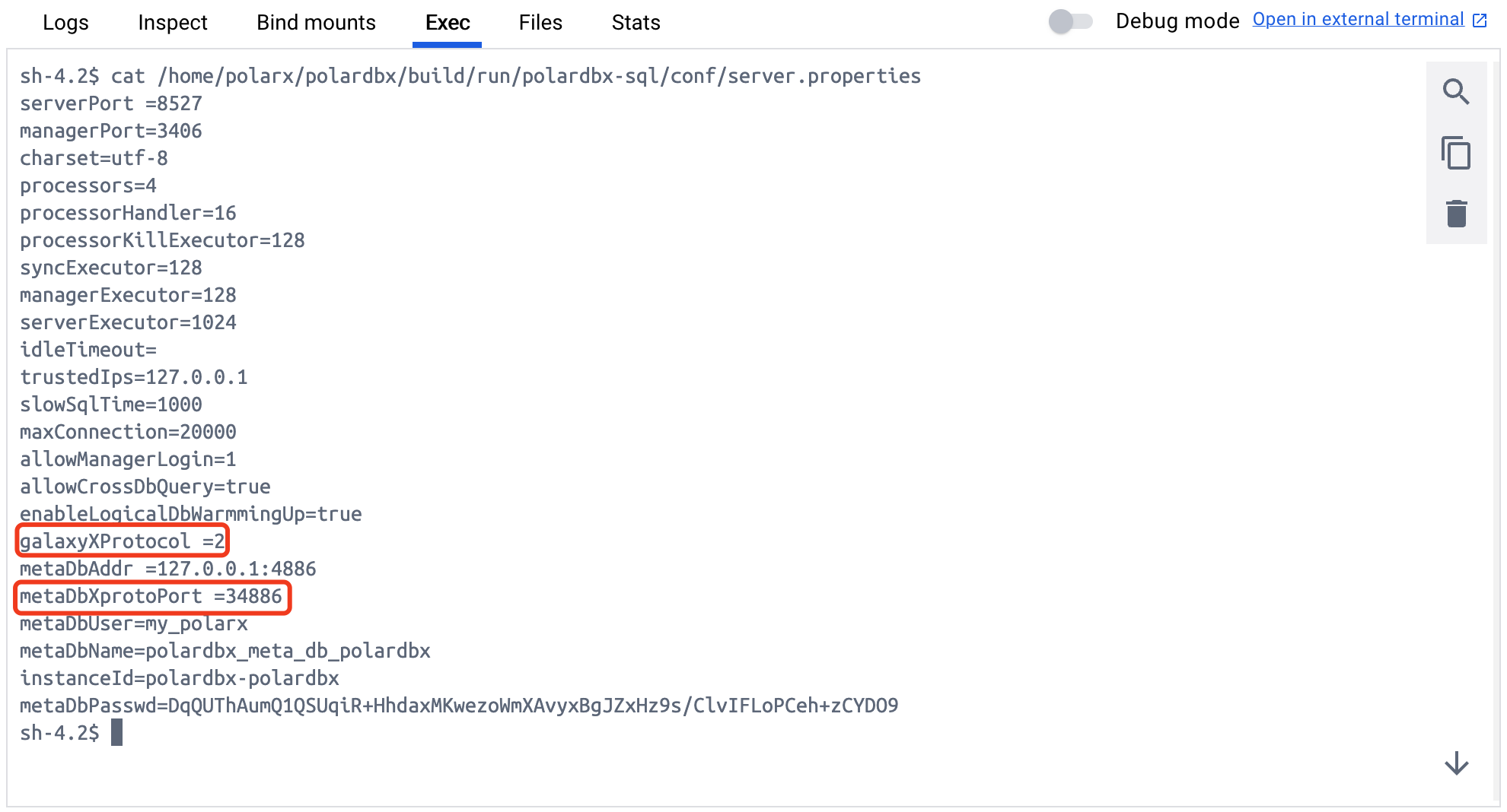 2024-09-02 08:12:44.168 [main] ERROR com.alibaba.polardbx.CobarConfig - [] Failed to init cobar server. com.alibaba.polardbx.common.exception.TddlRuntimeException: ERR-CODE: [PXC-10001][ERR_X_PROTOCOL_CLIENT] XDataSource to my_polarx#1c31783e@127.0.0.1:32886 Failed to init new TCP. XClientPool to my_polarx#1c31783e@127.0.0.1:32886 now 0 TCP(0 aging), 0 sessions(0 running, 0 idle), 0 waiting connection. at com.alibaba.polardbx.rpc.compatible.XDataSource.getConnection(XDataSource.java:210) at com.alibaba.polardbx.gms.metadb.MetaDbDataSource.initTsoServicesX(MetaDbDataSource.java:139) at com.alibaba.polardbx.gms.metadb.MetaDbDataSource.initXDataSourceByJdbcProps(MetaDbDataSource.java:202) at com.alibaba.polardbx.gms.metadb.MetaDbDataSource.initMetaDbDataSource(MetaDbDataSource.java:213) at com.alibaba.polardbx.gms.metadb.MetaDbDataSource.doInit(MetaDbDataSource.java:135) at com.alibaba.polardbx.common.model.lifecycle.AbstractLifecycle.init(AbstractLifecycle.java:43) at com.alibaba.polardbx.gms.metadb.MetaDbDataSource.getInstance(MetaDbDataSource.java:530) at com.alibaba.polardbx.gms.util.MetaDbUtil.getConnection(MetaDbUtil.java:53) at com.alibaba.polardbx.gms.metadb.schema.SchemaChangeAccessor.create(SchemaChangeAccessor.java:79) at com.alibaba.polardbx.gms.metadb.schema.SchemaChangeAccessor.doInit(SchemaChangeAccessor.java:75) at com.alibaba.polardbx.common.model.lifecycle.AbstractLifecycle.init(AbstractLifecycle.java:43) at com.alibaba.polardbx.gms.metadb.schema.SchemaChangeManager.doInit(SchemaChangeManager.java:62) at com.alibaba.polardbx.common.model.lifecycle.AbstractLifecycle.init(AbstractLifecycle.java:43) at com.alibaba.polardbx.gms.metadb.schema.SchemaChangeManager.getInstance(SchemaChangeManager.java:55) at com.alibaba.polardbx.config.loader.ServerLoader.initPolarDbXComponents(ServerLoader.java:222) at com.alibaba.polardbx.config.loader.ServerLoader.load(ServerLoader.java:191) at com.alibaba.polardbx.config.loader.ServerLoader.doInit(ServerLoader.java:96) at com.alibaba.polardbx.common.model.lifecycle.AbstractLifecycle.init(AbstractLifecycle.java:43) at com.alibaba.polardbx.CobarConfig.initCobarConfig(CobarConfig.java:80) at com.alibaba.polardbx.CobarConfig.<init>(CobarConfig.java:61) at com.alibaba.polardbx.CobarServer.<init>(CobarServer.java:154) at com.alibaba.polardbx.CobarServer.<clinit>(CobarServer.java:108) at com.alibaba.polardbx.server.TddlLauncher.main(TddlLauncher.java:126) Caused by: com.alibaba.polardbx.common.exception.TddlNestableRuntimeException: Failed to init new TCP. XClientPool to my_polarx#1c31783e@127.0.0.1:32886 now 0 TCP(0 aging), 0 sessions(0 running, 0 idle), 0 waiting connection. at com.alibaba.polardbx.rpc.pool.XConnectionManager.getConnection(XConnectionManager.java:514) at com.alibaba.polardbx.rpc.compatible.XDataSource.getConnection(XDataSource.java:193) ... 22 common frames omitted Caused by: com.alibaba.polardbx.common.exception.TddlNestableRuntimeException: Failed to init new TCP. at com.alibaba.polardbx.rpc.pool.XClientPool.getConnection(XClientPool.java:491) at com.alibaba.polardbx.rpc.pool.XClientPool.getConnection(XClientPool.java:287) at com.alibaba.polardbx.rpc.pool.XConnectionManager.getConnection(XConnectionManager.java:502) ... 23 common frames omitted Caused by: com.alibaba.polardbx.common.exception.TddlRuntimeException: ERR-CODE: [PXC-10001][ERR_X_PROTOCOL_CLIENT] XClientPool to my_polarx#1c31783e@127.0.0.1:32886 connect fail. at com.alibaba.polardbx.rpc.pool.XClientPool.getConnection(XClientPool.java:474) ... 25 common frames omitted 2024-09-02 08:12:44.171 [main] ERROR com.alibaba.polardbx.server.TddlLauncher - [] ## Something goes wrong when starting up the tddl server: java.lang.ExceptionInInitializerError at com.alibaba.polardbx.server.TddlLauncher.main(TddlLauncher.java:126) Caused by: ERR-CODE: [PXC-10001][ERR_X_PROTOCOL_CLIENT] XDataSource to my_polarx#1c31783e@127.0.0.1:32886 Failed to init new TCP. XClientPool to my_polarx#1c31783e@127.0.0.1:32886 now 0 TCP(0 aging), 0 sessions(0 running, 0 idle), 0 waiting connection. at com.alibaba.polardbx.rpc.compatible.XDataSource.getConnection(XDataSource.java:210) at com.alibaba.polardbx.gms.metadb.MetaDbDataSource.initTsoServicesX(MetaDbDataSource.java:139) at com.alibaba.polardbx.gms.metadb.MetaDbDataSource.initXDataSourceByJdbcProps(MetaDbDataSource.java:202) at com.alibaba.polardbx.gms.metadb.MetaDbDataSource.initMetaDbDataSource(MetaDbDataSource.java:213) at com.alibaba.polardbx.gms.metadb.MetaDbDataSource.doInit(MetaDbDataSource.java:135) at com.alibaba.polardbx.common.model.lifecycle.AbstractLifecycle.init(AbstractLifecycle.java:43) at com.alibaba.polardbx.gms.metadb.MetaDbDataSource.getInstance(MetaDbDataSource.java:530) at com.alibaba.polardbx.gms.util.MetaDbUtil.getConnection(MetaDbUtil.java:53) at com.alibaba.polardbx.gms.metadb.schema.SchemaChangeAccessor.create(SchemaChangeAccessor.java:79) at com.alibaba.polardbx.gms.metadb.schema.SchemaChangeAccessor.doInit(SchemaChangeAccessor.java:75) at com.alibaba.polardbx.common.model.lifecycle.AbstractLifecycle.init(AbstractLifecycle.java:43) at com.alibaba.polardbx.gms.metadb.schema.SchemaChangeManager.doInit(SchemaChangeManager.java:62) at com.alibaba.polardbx.common.model.lifecycle.AbstractLifecycle.init(AbstractLifecycle.java:43) at com.alibaba.polardbx.gms.metadb.schema.SchemaChangeManager.getInstance(SchemaChangeManager.java:55) at com.alibaba.polardbx.config.loader.ServerLoader.initPolarDbXComponents(ServerLoader.java:222) at com.alibaba.polardbx.config.loader.ServerLoader.load(ServerLoader.java:191) at com.alibaba.polardbx.config.loader.ServerLoader.doInit(ServerLoader.java:96) at com.alibaba.polardbx.common.model.lifecycle.AbstractLifecycle.init(AbstractLifecycle.java:43) at com.alibaba.polardbx.CobarConfig.initCobarConfig(CobarConfig.java:80) at com.alibaba.polardbx.CobarConfig.<init>(CobarConfig.java:61) at com.alibaba.polardbx.CobarServer.<init>(CobarServer.java:154) at com.alibaba.polardbx.CobarServer.<clinit>(CobarSer