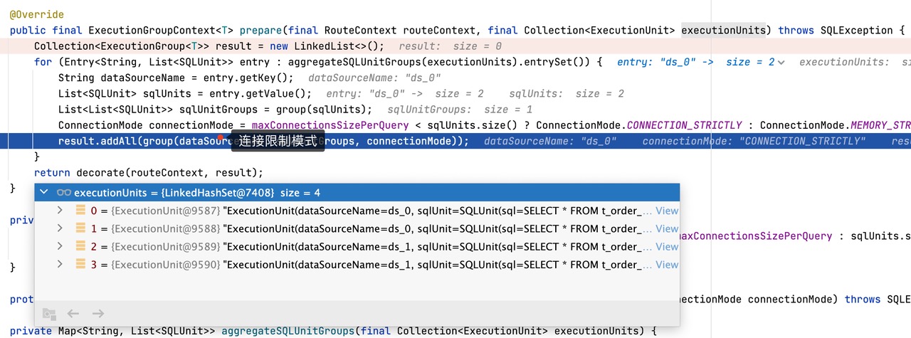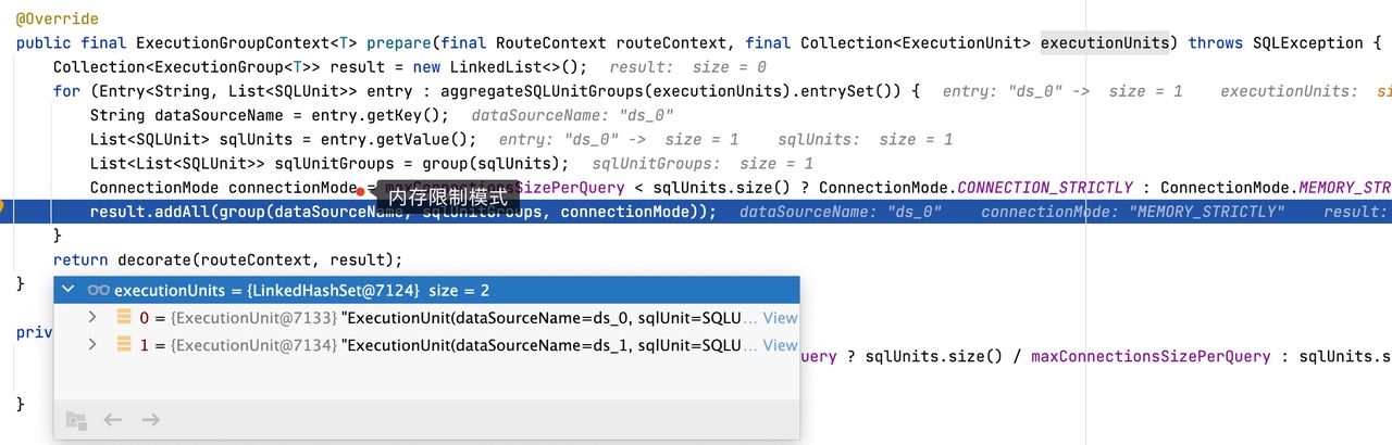 CONNECTION_STRICTLY 代表连接限制模式,当采用连接限制模式时,SQL 执行引擎只会在同一个数据源上创建一个连接,严格控制对数据库连接资源的消耗,在真实 SQL 执行之后立即将结果集加载至内存,因此会占用部分内存空间。