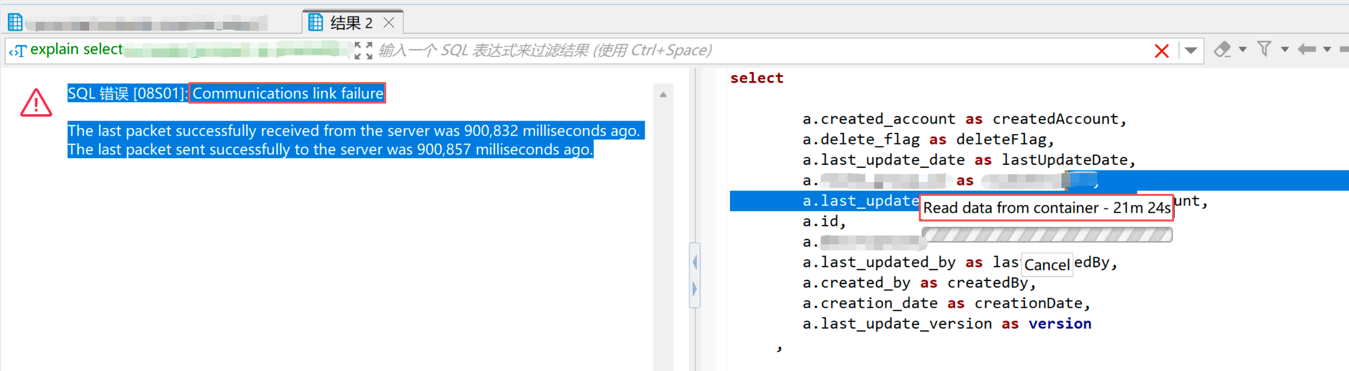 最近,用户在测试 ShardingSphere 联邦查询功能时,反馈了 1 条 2w6k 行的超长 SQL,执行时出现了 Communications link failure 异常,SQL 在 Proxy 接入端执行了 20 多分钟后最终超时断开。