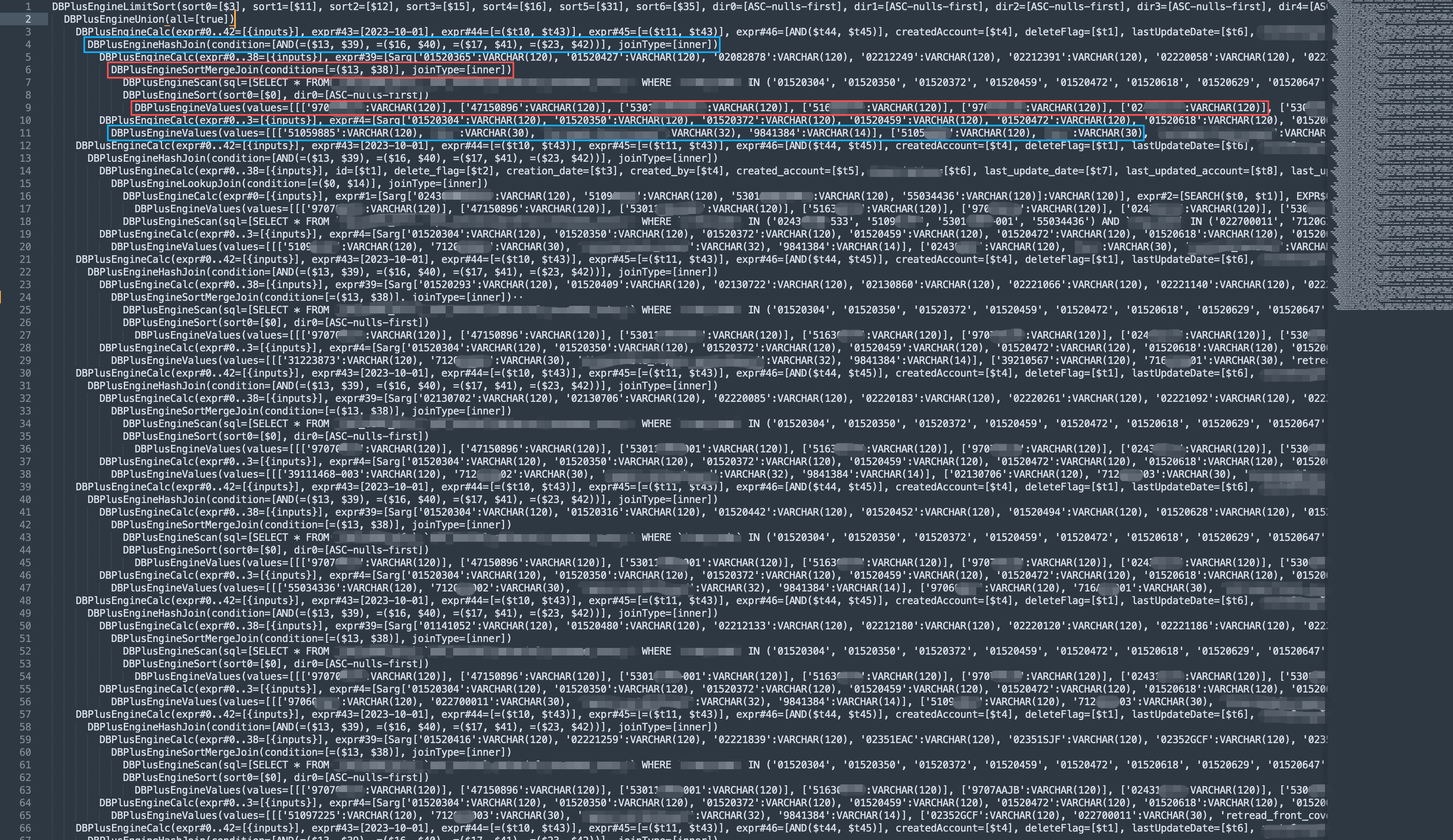 原始 SQL 中的单列 IN 被转换为红色部分的 DBPlusEngineSortMergeJoin,通过关联 DBPlusEngineValues 中的常量实现 IN 过滤,而多列 IN 则被转换为蓝色部分的 DBPlusEngineHashJoin,同样通过关联 DBPlusEngineValues 中的常量实现多列 IN 过滤。这样的转换逻辑影响了 DBPlusEngineScan 中下推 SQL 的过滤条件,导致部分 IN 过滤条件没有下推下去,下推 SQL 查询的数据量过大。