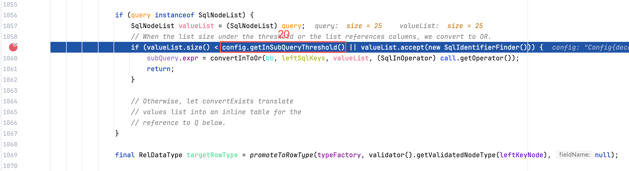 由于我们的 IN 值个数不小于 20,逻辑会继续向下执行,将 IN 转换为 RexSubQuery 子查询。从源码注释中,我们也可以看到,后续这个对象会通过 SubQueryRemoveRule 规则进行优化。