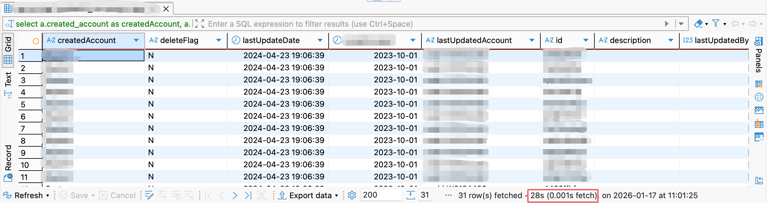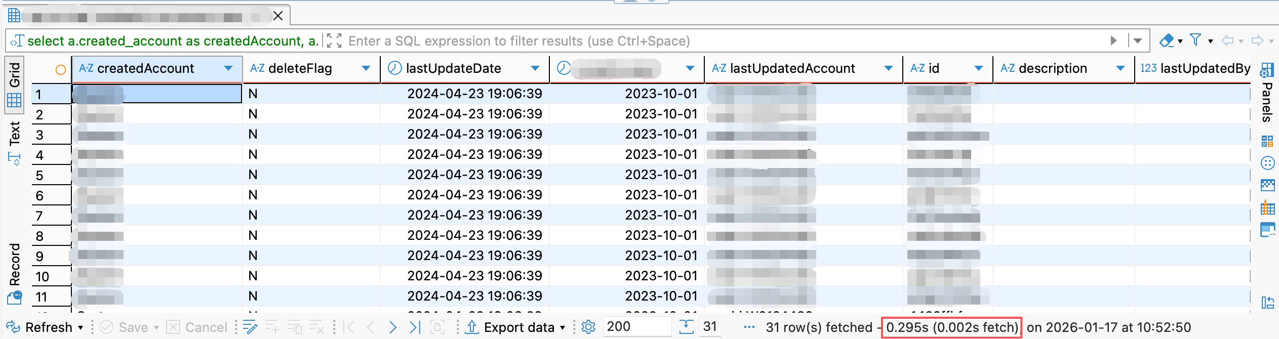 测试 SQL 执行计划符合预期后,我们再用复杂的业务 SQL 对比测试,观察下优化前后的查询性能。