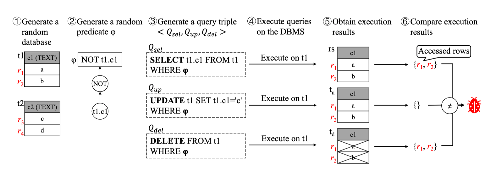 DQE 测试方法的核心思想是:使用相同谓词(WHERE 条件)生成 SELECT、UPDATE 和 DELETE 语句,然后分别执行这 3 条语句,观察他们操作的数据行,如果操作的数据行不一致,则可能存在逻辑错误。