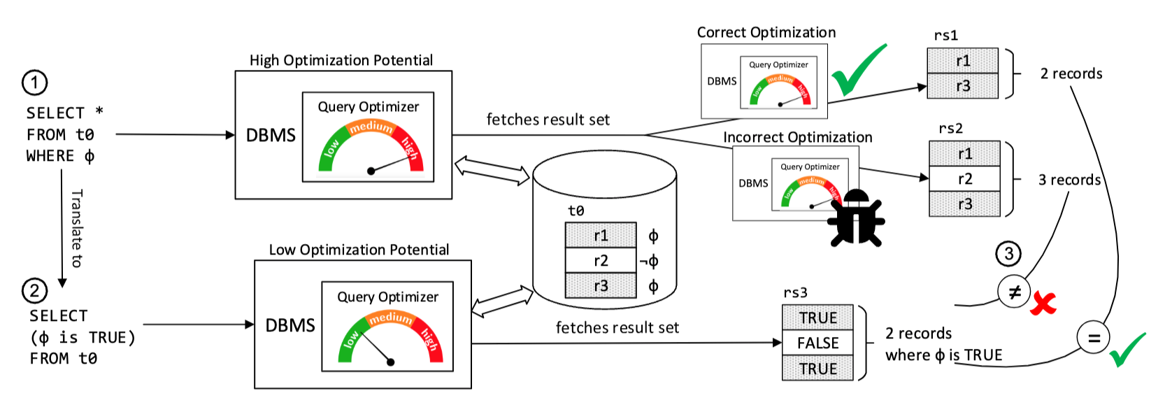 SELECT (φ IS TRUE) FROM t0,这种查询缺乏 WHERE 条件,数据库管理系统必须检索所有记录; - 执行优化 SQL 和未优化 SQL 并比较结果集,如果未优化 SQL 返回 TRUE 的行数不等于优化 SQL 返回行数,则说明存在 BUG。