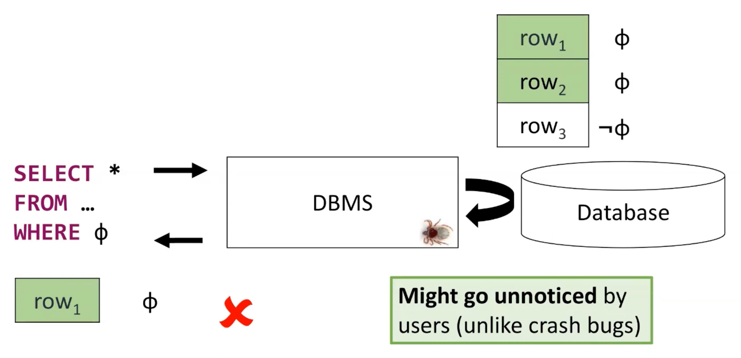 下图展示了一个具体的逻辑错误:当用户输入 SQL 语句查询数据时,原本数据库中存在 2 条匹配的数据,但由于数据库的 SQL 引擎存在逻辑错误,最终只返回了 1 条数据。除了少返回数据行外,逻辑错误还包含:错误返回过滤条件外的结果,返回的数据行内容错误等。