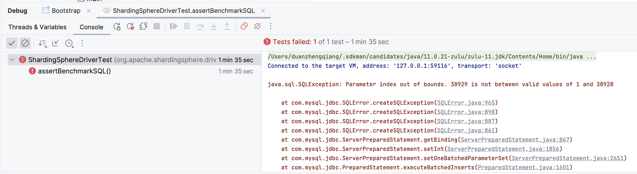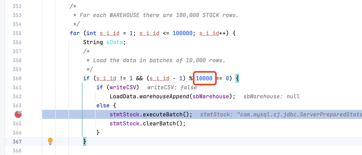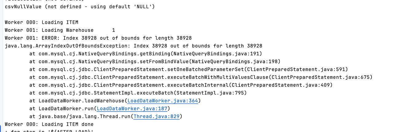java.lang.ArrayIndexOutOfBoundsException: Index 38928 out of bounds for length 38928 at com.mysql.cj.NativeQueryBindings.getBinding(NativeQueryBindings.java:191) at com.mysql.cj.NativeQueryBindings.setFromBindValue(NativeQueryBindings.java:198) at com.mysql.cj.jdbc.ClientPreparedStatement.setOneBatchedParameterSet(ClientPreparedStatement.java:591) at com.mysql.cj.jdbc.ClientPreparedStatement.executeBatchWithMultiValuesClause(ClientPreparedStatement.java:675) at com.mysql.cj.jdbc.ClientPreparedStatement.executeBatchInternal(ClientPreparedStatement.java:409) at com.mysql.cj.jdbc.StatementImpl.executeBatch(StatementImpl.java:795) at LoadDataWorker.loadWarehouse(LoadDataWorker.java:364) at LoadDataWorker.run(LoadDataWorker.java:187) at java.base/java.lang.Thread.run(Thread.java:1583)