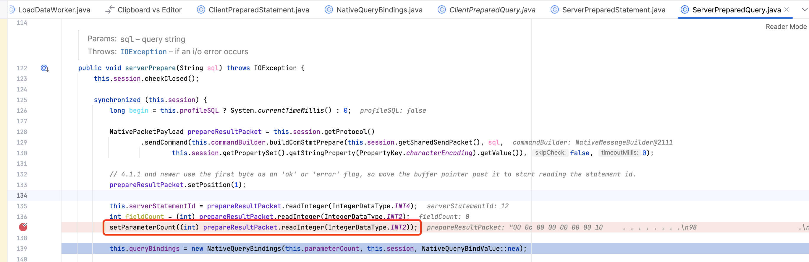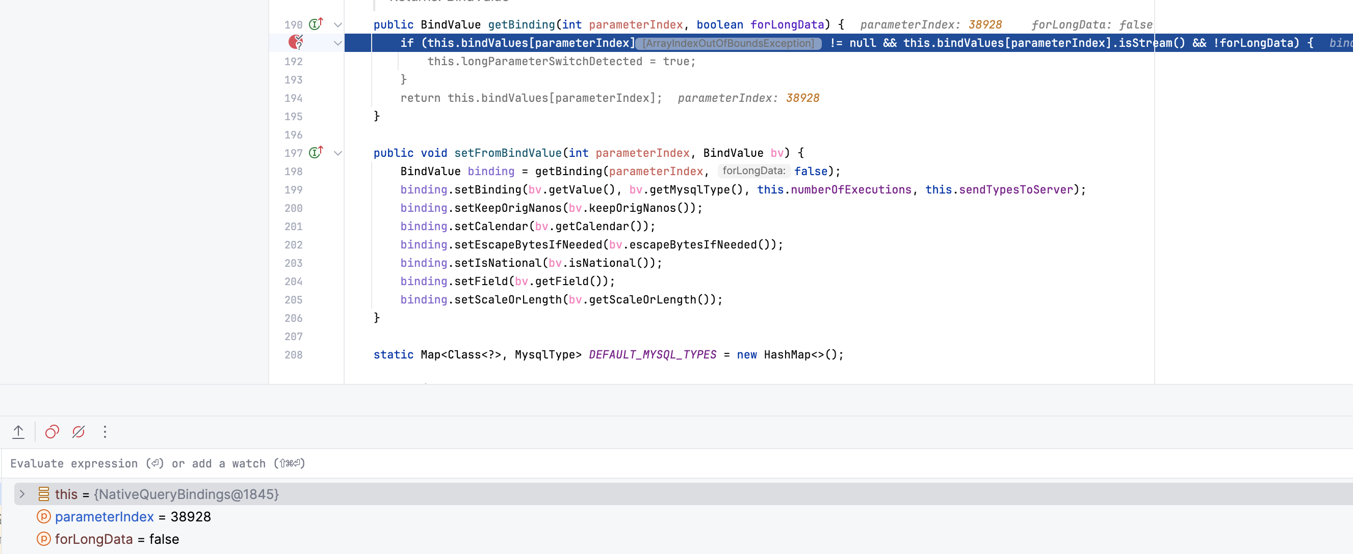 最终 ArrayIndexOutOfBoundsException 异常出现在 MySQL 驱动中,NativeQueryBindings#191 逻辑根据参数偏移位 parameterIndex 获取对应的参数值。从异常信息 Index 38928 out of bounds for length 38928 可以看出,bindValues 数组当前只有 38928 个值,需要通过 0-38927 来获取,初步判断应该是 Proxy 对于预编译 SQL 中的参数处理存在问题。