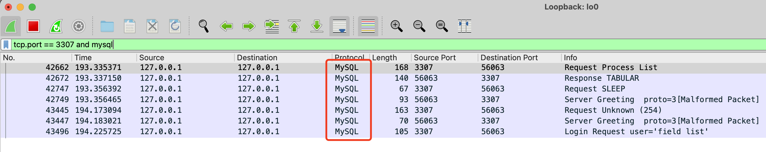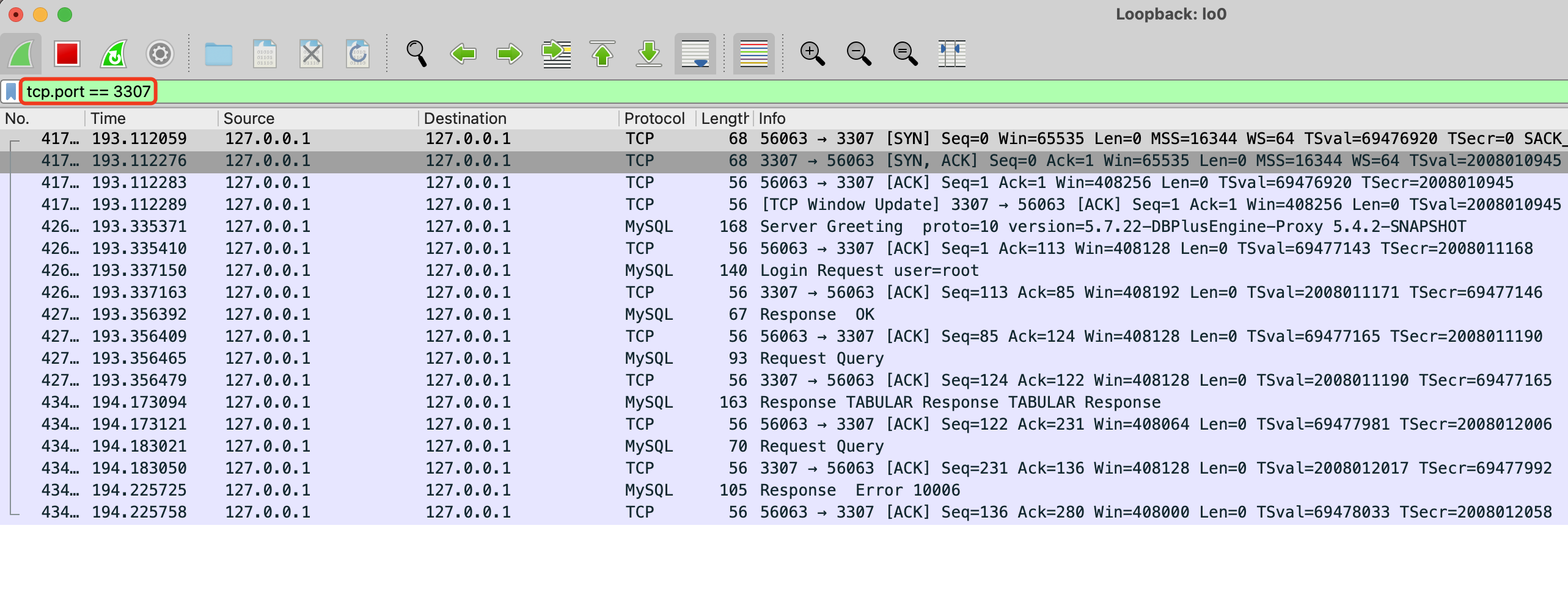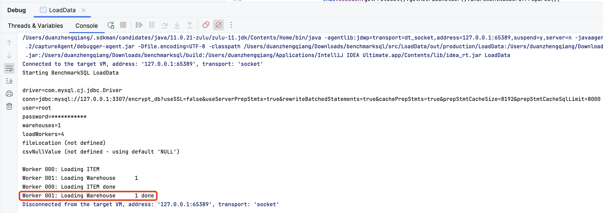 既然 MySQL 协议中定义的 parameterCount 最大为 65535,那么 BenchmarkSQL 测试原生 MySQL 也应当报错,而实际反馈原生 MySQL 不会出现异常。为了一探究竟,我们打算再测试下原生 MySQL,看下协议上是如何处理的。调整 JDBC URL 直接指向 MySQL 数据库,并执行单测程序。