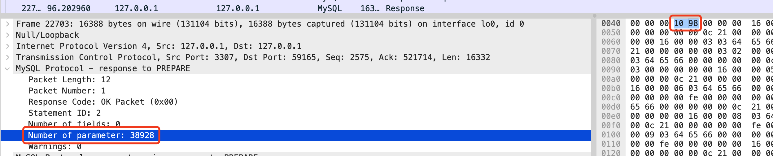 测试并抓包后发现,原生 MySQL 同样不支持 2 字节以上的 parameterCount,MySQL 会直接抛出异常。此时 MySQL 驱动捕获到 1390 异常码后,会将预编译 SQL 转换为非预编译 SQL,直接将参数拼接在 VALUES 中,然后再次发起请求。